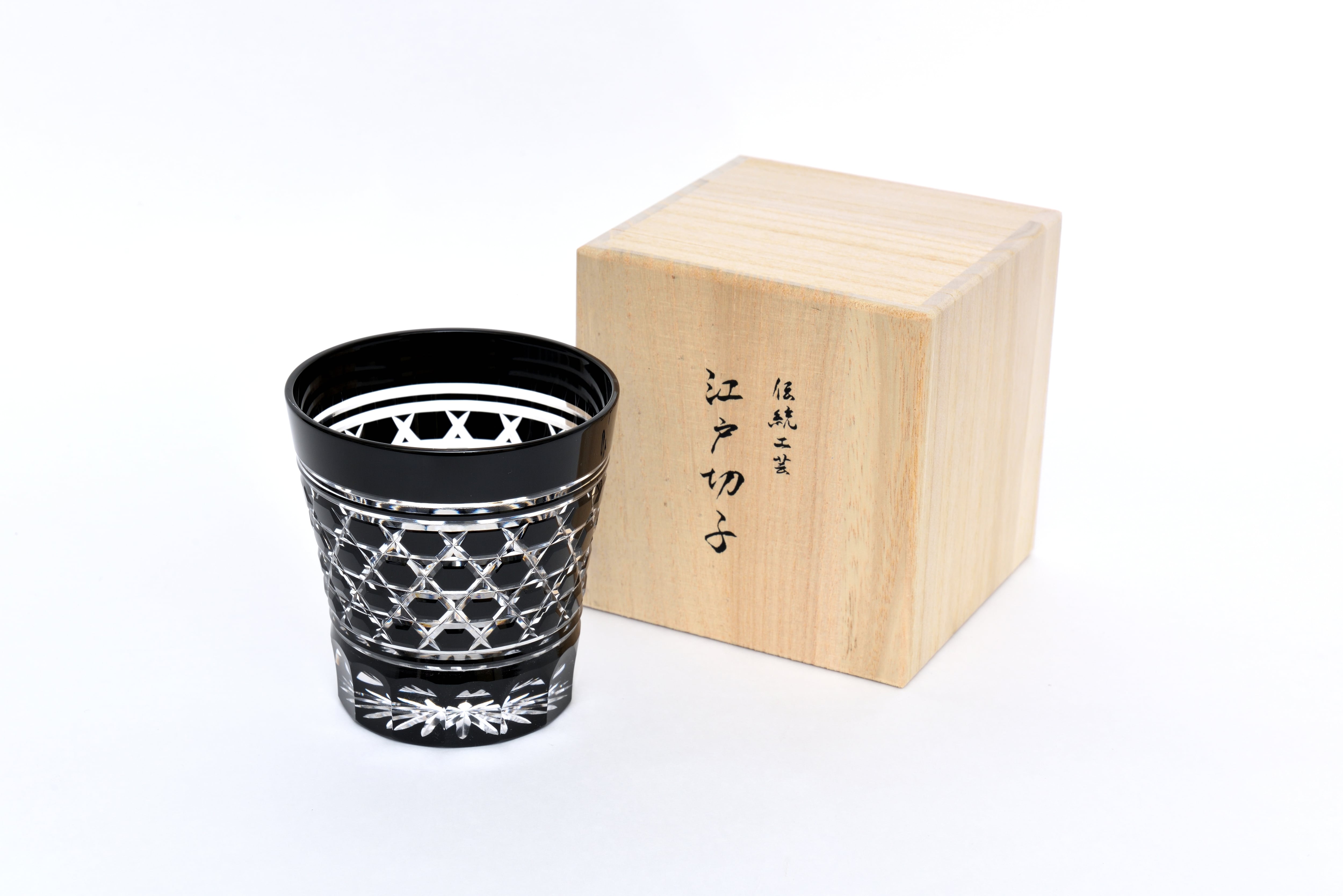 江戸切子 ロックグラス 黒 六角籠目 木箱入り SH-OG614BR